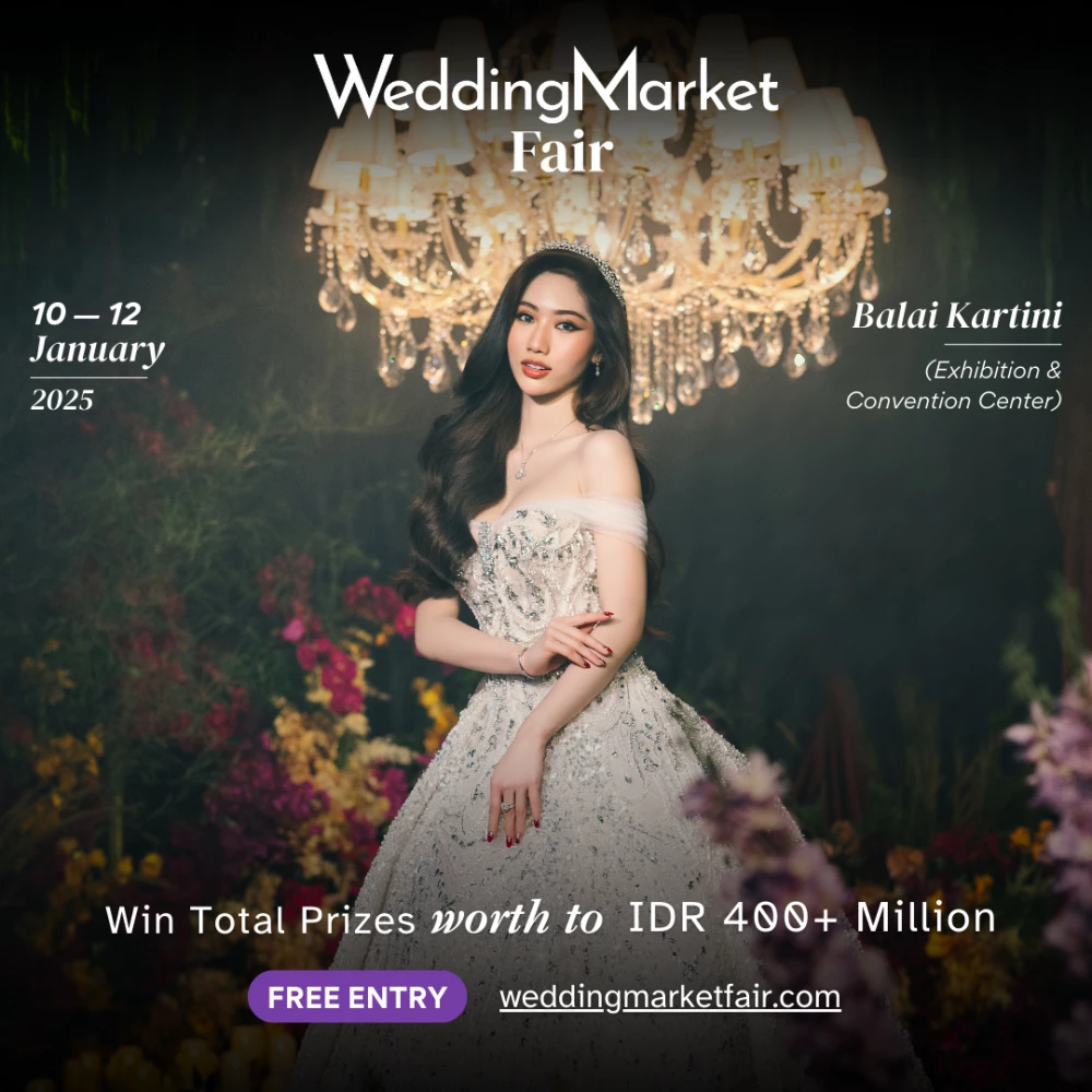 WeddingMarket Fair hadir untuk memenuhi kebutuhan pernikahan impian calon pengantin dengan berbagai vendor pernikahan terbaik! Menghadirkan 200+ booth vendor pernikahan dari 20+ kategori menjadikan WeddingMarket Fair sebagai salah satu pameran tematik pernikahan terbesar di Indonesia! Dengan mengusung konsep tema Romantic Blossom, WeddingMarket Fair kali ini diselenggarakan pada: Tanggal : Jum'at, Sabtu dan Minggu, 10 - 12 Januari 2025 Pukul : 10.00 - 21.00 WIB Tempat : Balai Kartini Exhibition & Convention Center Dapatkan juga berbagai PROMO MENARIK & BERAGAM ACTIVATION selama pameran, seperti: - Kesempatan memenangkan Grand Prize berupa Mobil,Sepeda Motor dan Uang Tunai - Hadiah Langsung berupa Berlian, Voucher Hotel, Honeymoon, dan hadiah lainnya senilai ratusan juta. - Promo Spesial dari berbagai vendor - Voucher Discount untuk berbelanja selama pameran - Berbagai Talkshow seputar pernikahan - Serta Beragam dekorasi estetik dan photobooth menarik! Pesan tiket masuk sebelum berkunjung karena PERSEDIAAN TIKET GRATIS TERBATAS! Sampai jumpa di WeddingMarket Fair 2025